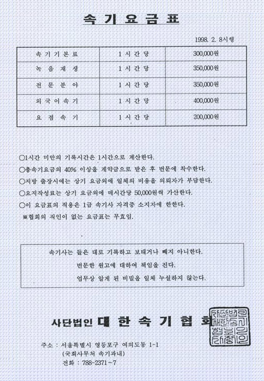 * 사단법인 대한속기협회의 공정요금표는 여기를 참고하십시오.